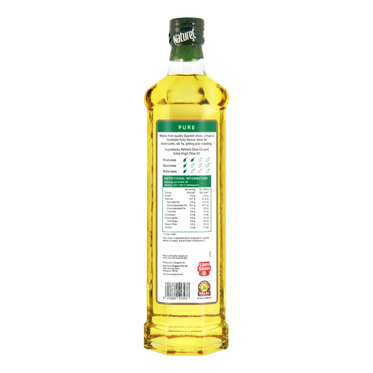 | KEY INFORMATION | Naturel Pure Olive Oil, made from quality spanish olives, has a moderate fruity flavor. It is also lower in saturated fat. |