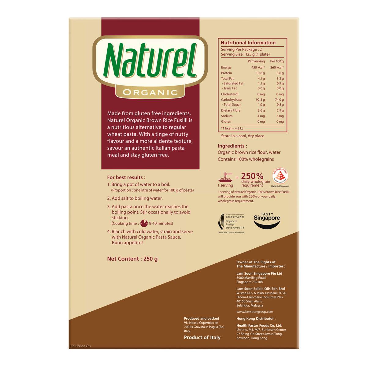 | KEY INFORMATION | Made from gluten free ingredients, Naturel Organic Brown Rice Fusilli is a nutritious alternative to regular wheat pasta. With a tinge of nutty flavour and a more al dente texture, savour an authentic Italian pasta meal and stay gluten free. |