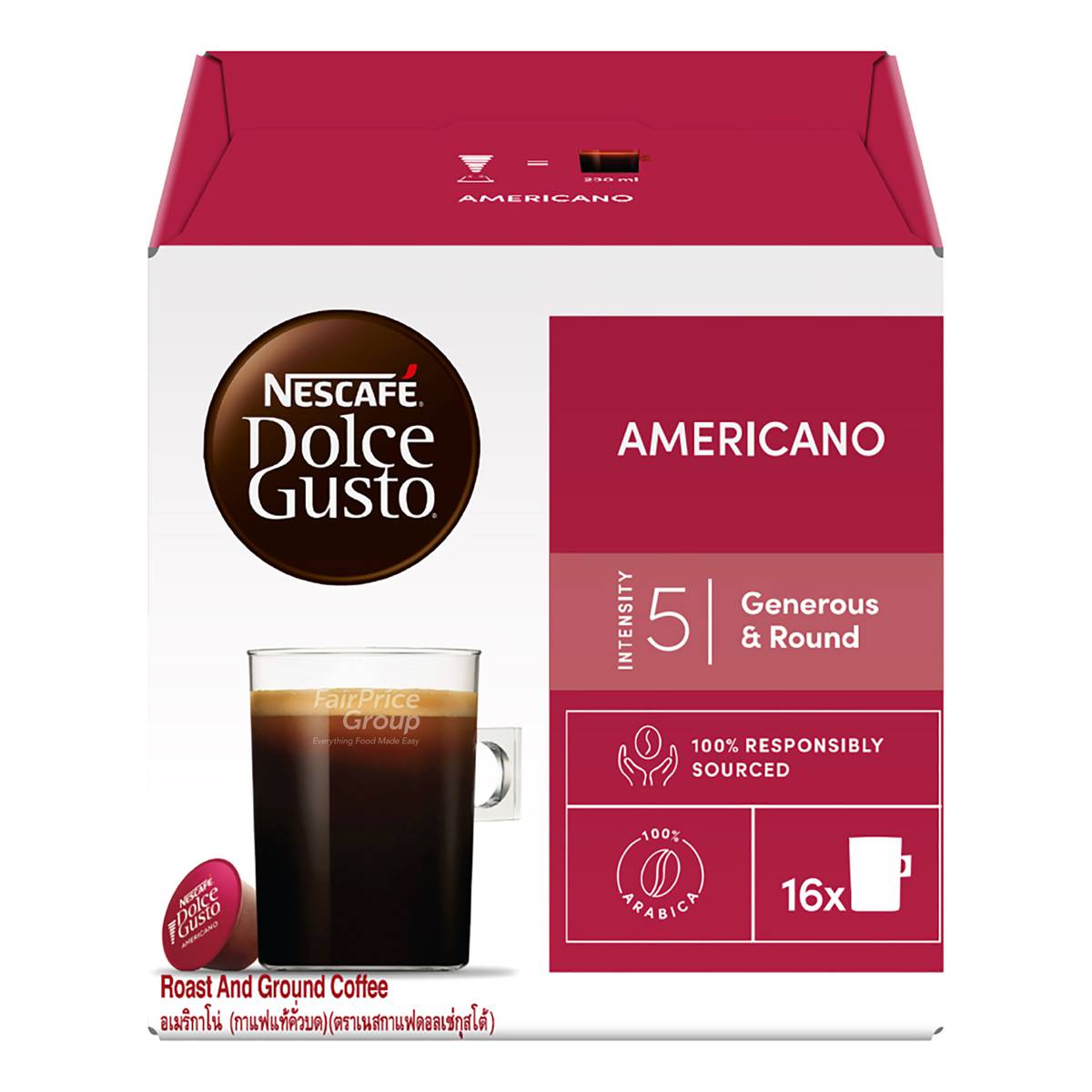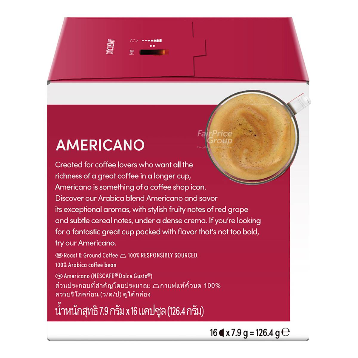 | KEY INFORMATION | Enjoy the elegant, fruit and floral NESCAFE Dolce Gusto Americano. This is a light bodied, 100% Arabica long cup (230ml) with a fine crema and refined hints of lychee and rose in a perfectly mug-sized coffee. Intensity 4/9. The box contains 16 capsules designed for NESCAFÉ Dolce Gusto capsule coffee machines for you to prepare 16 cups of Americano. |