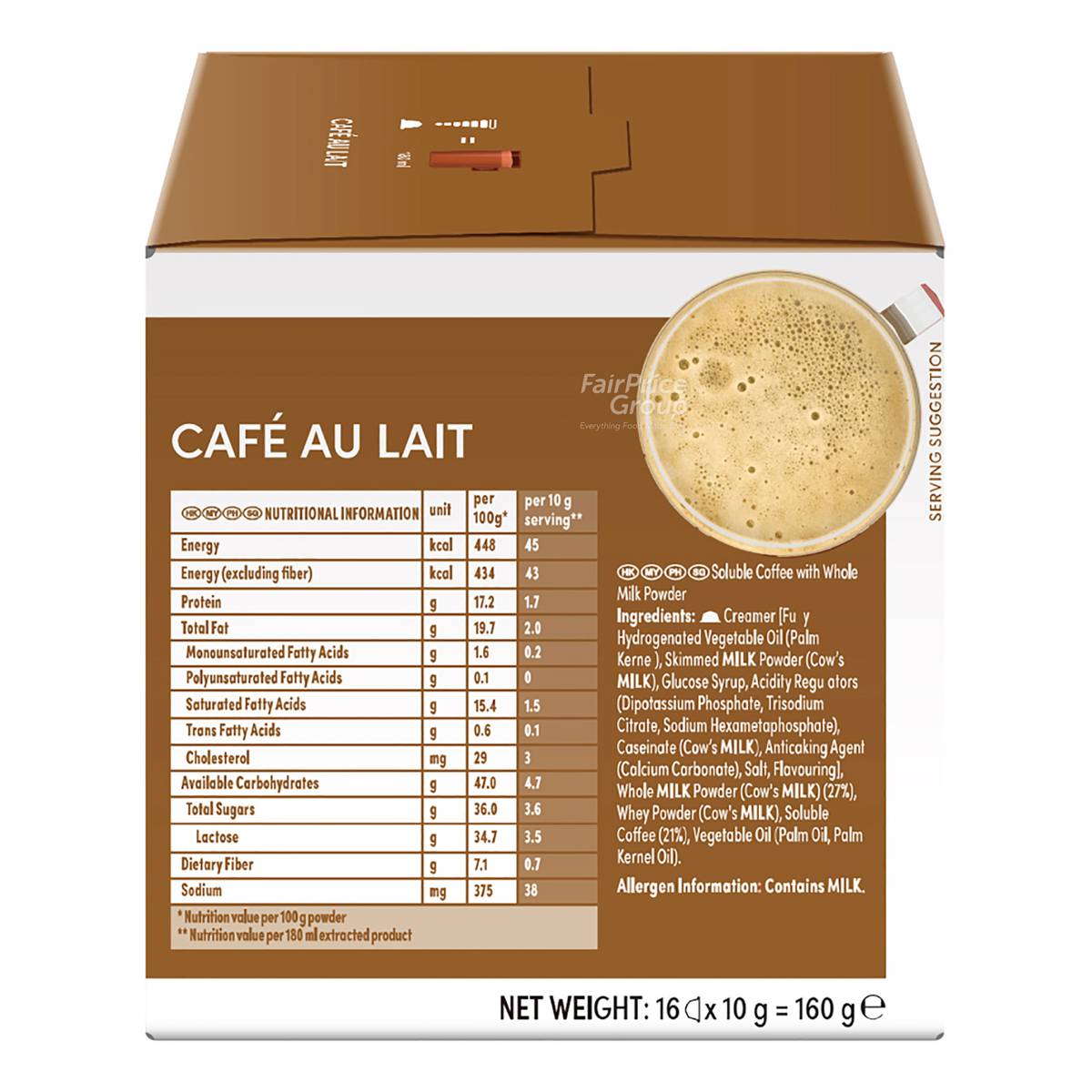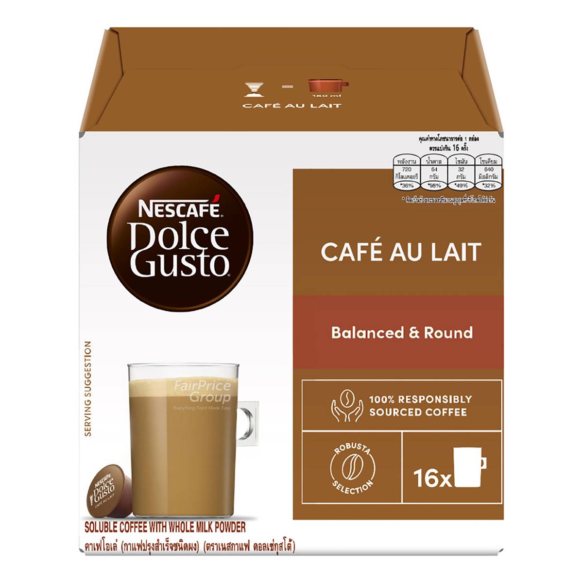 | KEY INFORMATION | Discover Nescafe Dolce Gusto Cafe Au Lait, a balanced combination of intense coffee and smooth milk in one capsule, best served in a mug (at 180ml). |