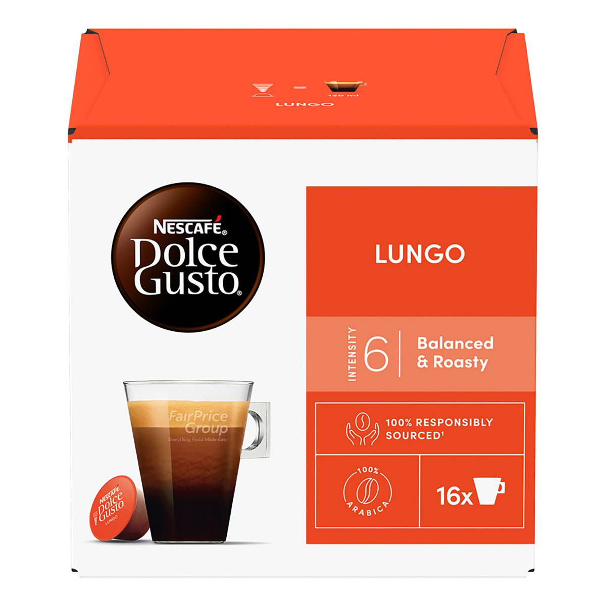 | KEY INFORMATION | Discover Nescafe Dolce Gusto Lungo, a smooth medium-dark roast coffee. With an intensity of 6 out of 9, this coffee has the rich flavours and intense aromas of an espresso in a longer (120ml), smoother cup with a fine silky crema. Savour the complex, aromatic notes of roasted coffee and subtle undertones of blackcurrant in this smooth, long cup. |
