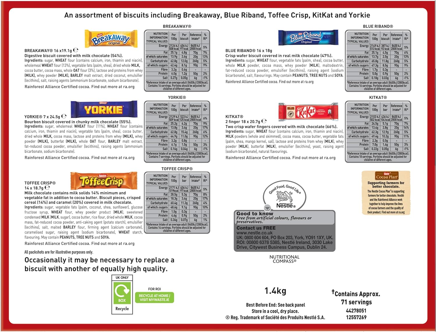 - Includes 18x KITKAT, 16x BREAKAWAY, 16x BLUE RIBAND, 14x TOFFEE CRISP and 7x YORKIE