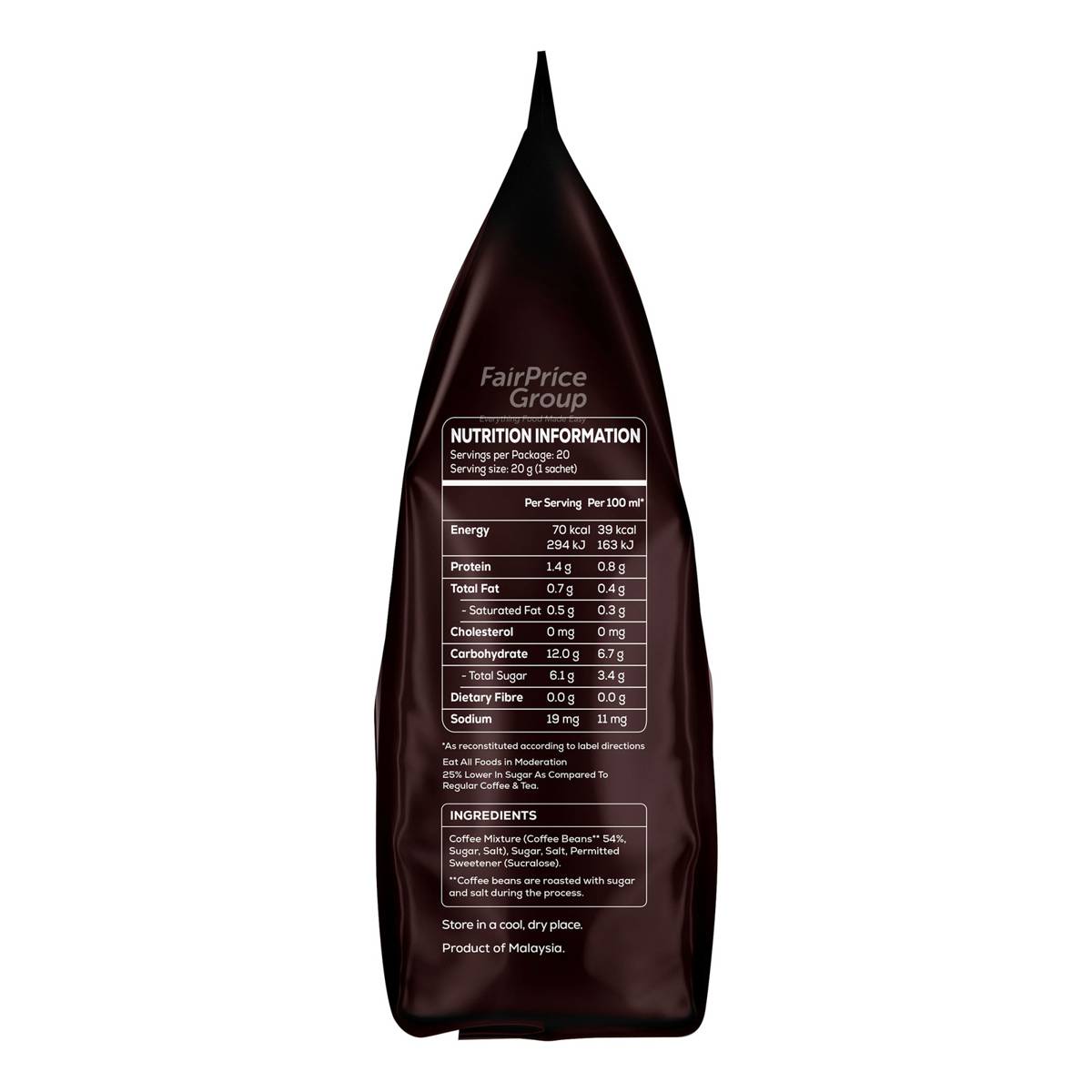 | KEY INFORMATION | White coffee “o” with sugar added, roasted to perfection, creating a thick and bold full bodied and aromatic taste! It also provides a strong , dark palette with a nice bittersweet balance. |