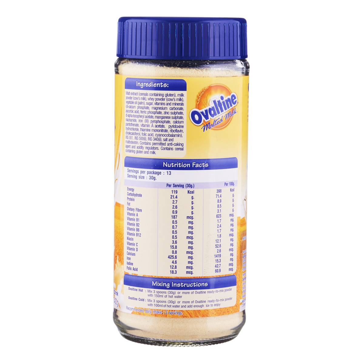 | PREPARATION | Mix 3 spoons (30g) or more of ready-mixed Ovaltine with 150ml hot water |