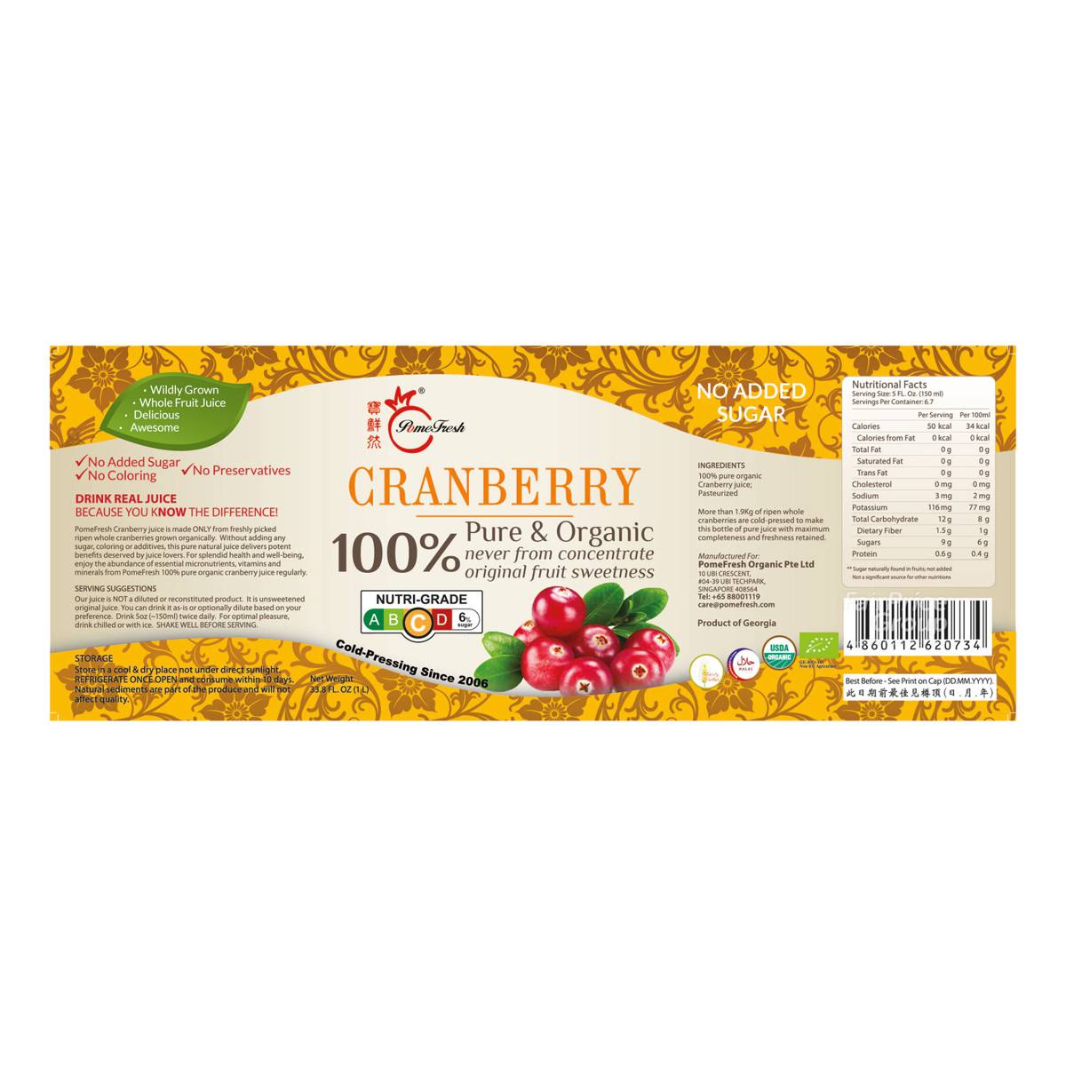 PomeFresh Juice Bottle Drink – Pure Organic Cranberry