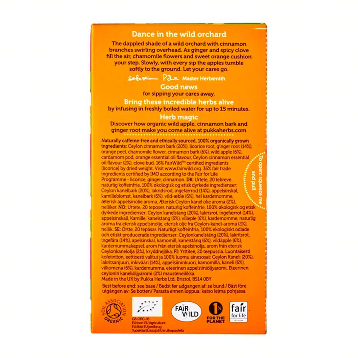 | PREPARATION | Wild Apple and Cinnamon tea, a sunlit orchard of organic warmth and sweet spice. Is Organic, Caffeine Free, Vegetarian,Vegan, Wheat free, Gluten free,Added sugar free, Dairy free, Soya free, Nut free, Kosher, Fair wild |