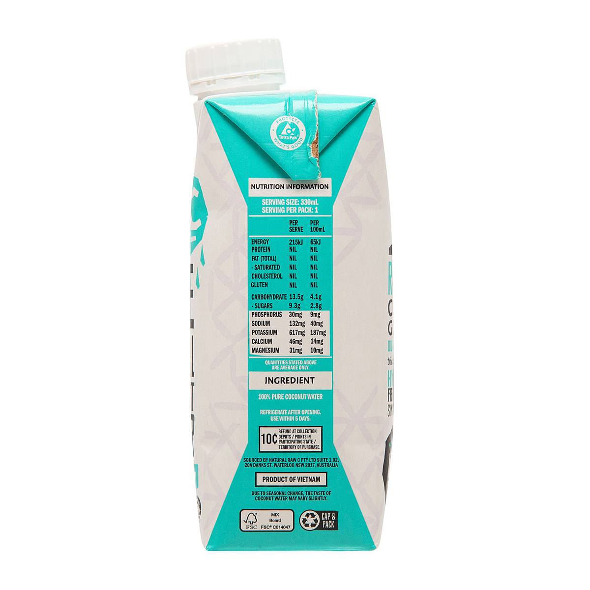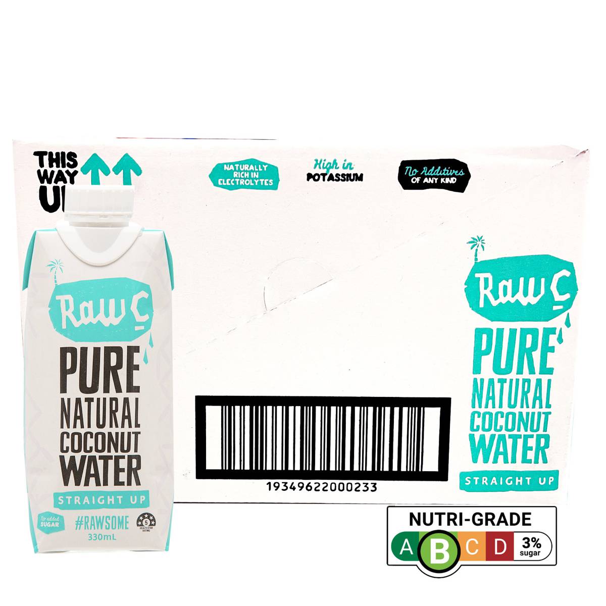 | KEY INFORMATION | The tastiest, all natural, single-source, fresh coconut water. We never add anything else to Raw C Straight Up Coconut Water. No concentrate. No sugar. Nothing! We just Crack. Pack. Send. All you need to do is open a carton and enjoy the refreshing taste of 100% pure, natural coconut water. 100% pure natural coconut water, always from fresh coconut water, Gluten-free, No added sugar, fat-free, Five key naturally occurring electrolytes for hydration calcium, magnesium, phosphorus, sodium and potassium, High in potassium, Natural sports drink |