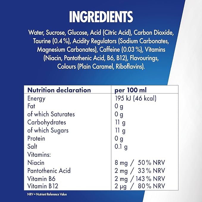 Water, Sucrose, Glucose, Acidifier Citric Acid, Carbon Dioxide, Taurine (0.4%), Acidity Regulator (Sodium Carbonates, Magnesium Carbonate), Caffeine (0.03%), Vitamins (Niacin, Pantothenic Acid, B6, B12), Flavourings, Colours (Caramel, Riboflavin)