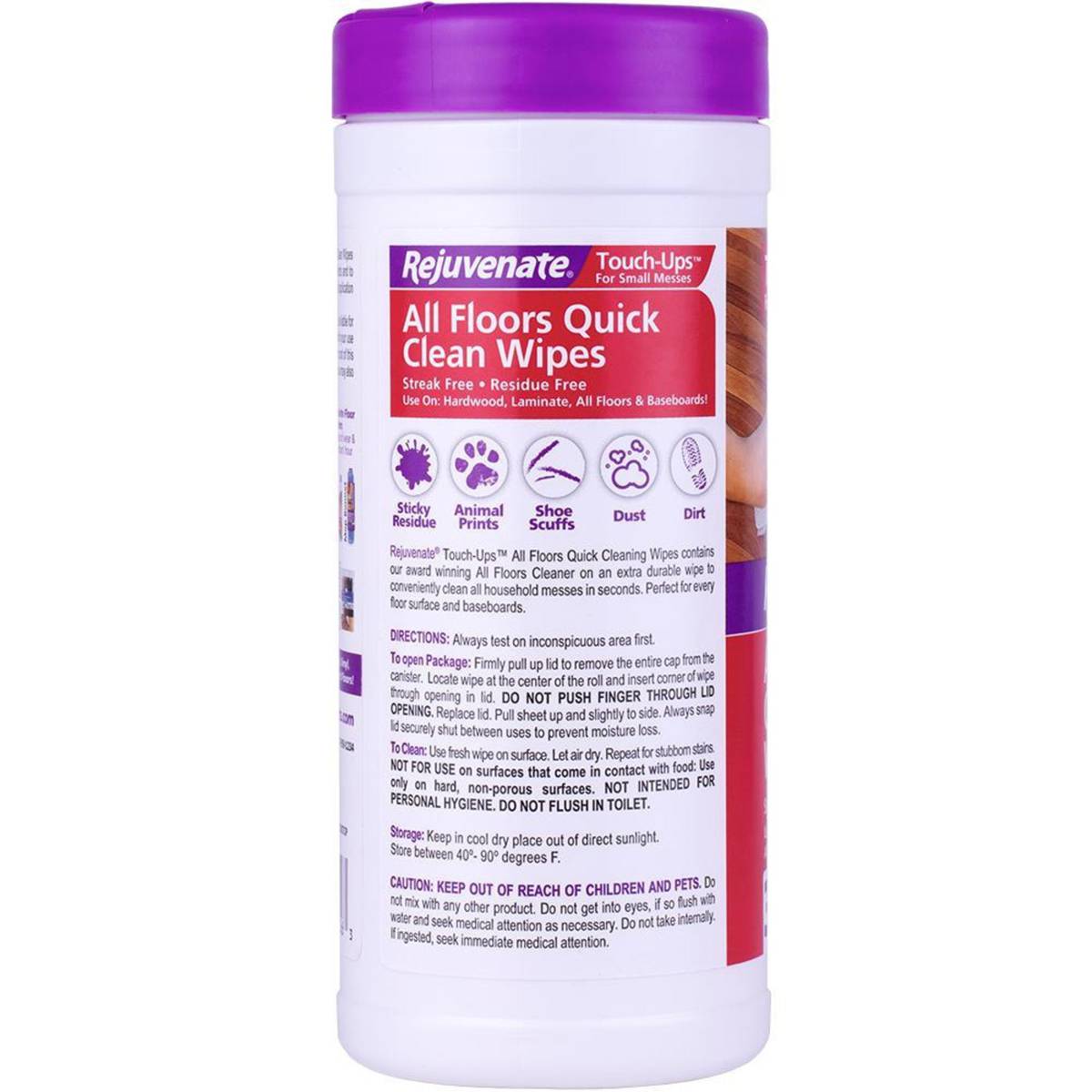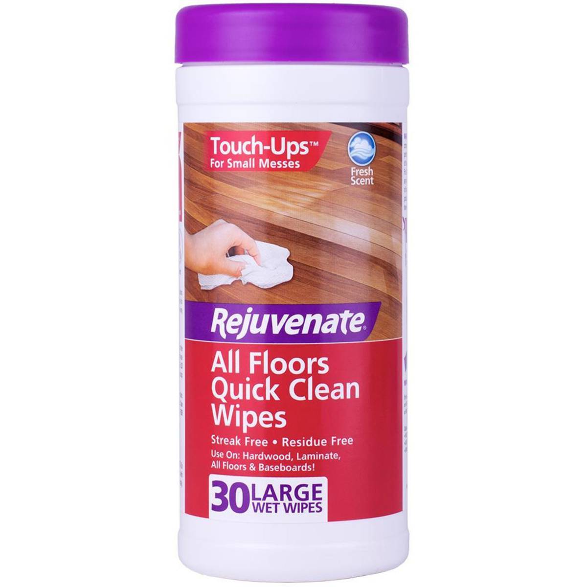 | KEY INFORMATION | The Rejuvenate All Floors Quick Clean Wipes are ready-to-use cleaning wipes that are formulated free of waxes & oils, leaving no residue and no streaking while to getting rid of dirt & grime on all floor finishes, cabinets, furniture and more. This premoistened floor cleaning wipe gets rid of the toughest dirt and grime without leaving behind hazy streaks or a dulling shine. Its safe to use every day and the pH-balanced formula with shine booster technology wont harm your floor’s finish. Make your home new again with Rejuvenate Brand specialty cleaning and restoration products that compliment your floors, cabinets, furniture, cooktops, stainless steel, stone surfaces, windows, siding and more. Product Highlights 30 Large Floor Cleaning Wet Wipes 30 Large Floor Cleaning Wet Wipes – Clean Up Small Messes on Floors, Baseboards, Cabinets, Furniture and more |