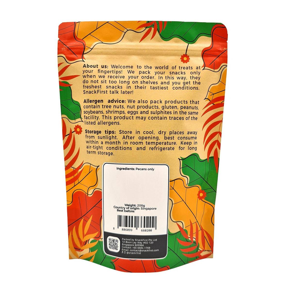 | KEY INFORMATION | Don’t you think pecans are shaped just like our brains? The unique colour and shape makes them cousins of walnuts and with similar nutritional benefits as walnuts. Even the taste is similar to fresh walnuts, but with a stronger earthy taste and without the bitterness that some people might come to associate with walnuts. They are usually eaten raw for maximum health benefits or used for baking, most commonly in pecan pies. If you like walnuts, you will definitely like these pecans that are rarely sold elsewhere. If you are looking to bake them, raw pecans would be suitable. For snacking, baked pecans will be the best! All natural flavour, no additional ingredients Ingredient: Pecans only |