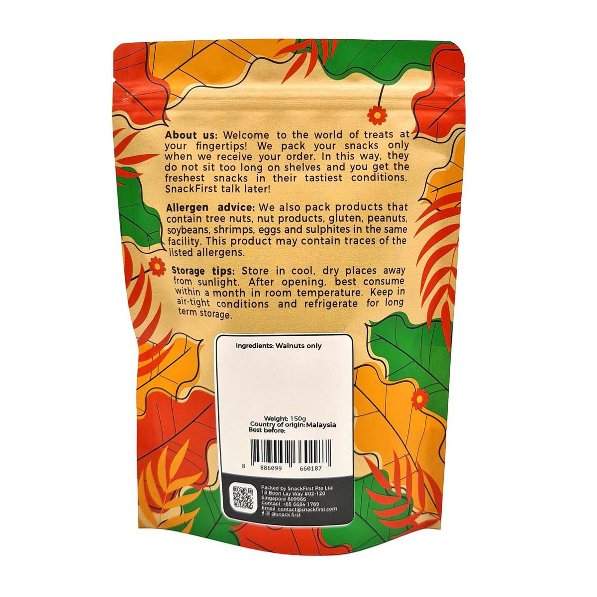| KEY INFORMATION | Walnuts are the superfood of the century due to the high amount of antioxidants polyphenols, almost twice the amount of almonds and other nuts. They are not called the King of Nuts for nothing. Enjoy the crunchy but not too hard bites, with a woody, earthy, wholesome flavour. It is highly recommended that you take 14 halves of these walnuts daily to ensure maximum health benefits and total enjoyment. Able to snack every day while boosting your nutrition content? A dream come true. Raw nuts have the most nutrition as they are not ‘processed’ and retains the most vitamins. If you do not want salt in your snacks but yet prefer better crunchiness, baked nuts are just for you. If you prefer better taste and crunchiness, we would recommend Sea Salt Roasted nuts instead. Ingredient: Walnuts from USA only. Country of origin: Malaysia |
