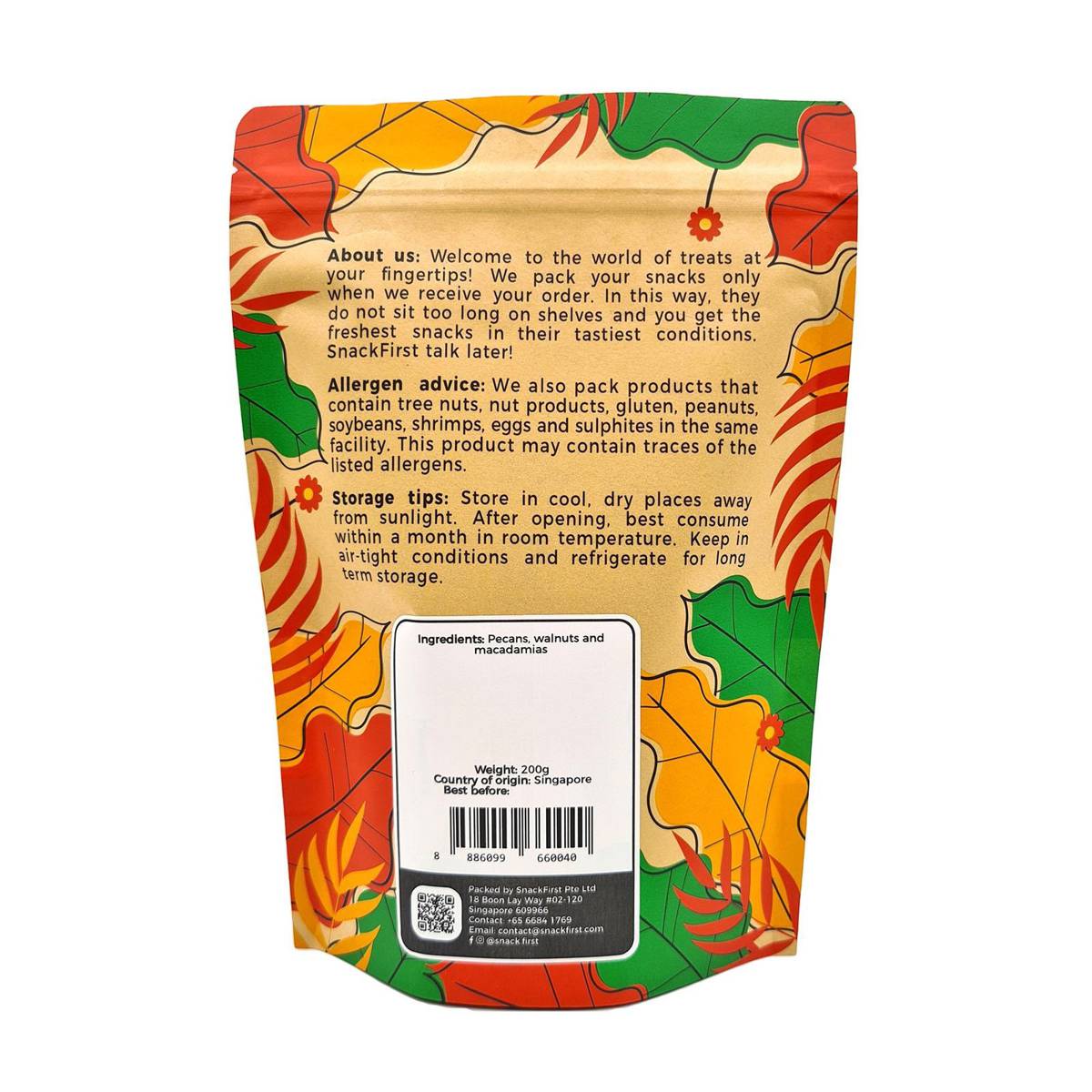 | KEY INFORMATION | Ketogenic diet is the all new diet to lose weight fast! In short, it is to decrease the intake of carbohydrates and maximise the amount of fats content. We have mix together these 3 nuts that have lowest amount of carbohydrates among all nuts! Pecans has 1.1g of carbohydrates, while macadamia nuts contain 1.5 g and walnuts has 1.9 g. A handful of nuts and you should be able to achieve less than 100g of carbs a day! All natural flavour, no additional ingredients Ingredients: Pecans, walnuts, macadamias Country of origin: Singapore |