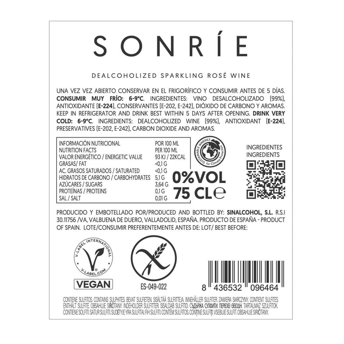 | KEY INFORMATION | Sonrie Sparkling Rose is an alcohol-free sparkling rose wine to toast in style, at any time, with your special people. This non-alcoholic sparkling wine is made with Tempranillo and Verdejo grapes. Pale salmon pink in colour with violet and blue reflections with a fine and persistent bubble. Predominant aromas of red fruit, berries and floral nuances accompanied by stone fruit. Pleasant on the palate with medium acidity and hints of red fruit enhanced by the pleasant and refreshing carbonation sensation. *JWC discount is not applicable on Marketplace products* |