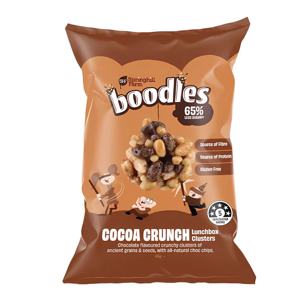 | KEY INFORMATION | Springhill Farm Cocoa Crunch Lunchbox Clusters are chocolate flavoured crunchy clusters of ancient grains and seeds, with all-natural choc chips. The struggle for parents to ensure a balances diet for children has been well documented over millennia (in fact, we’re pretty sure there are cave painting somewhere of parents hiding veggies in their kids’ snacks). We KNOW kids are going to love these crunchy clusters and better yet, parents will love them as they’re packed full of fibre and proteins (with 5 Health Stars to boot!). |