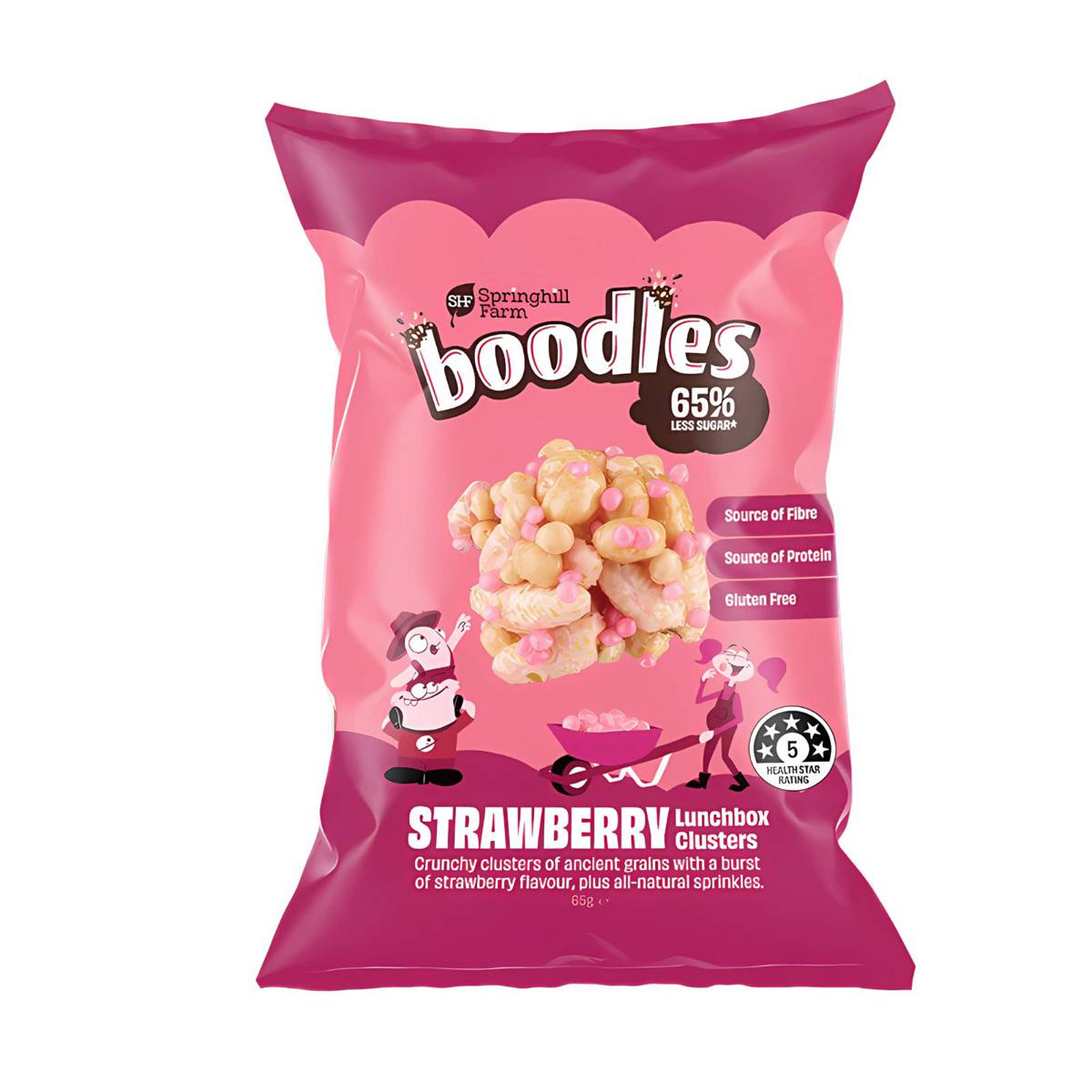 | KEY INFORMATION | Crunchy clusters of ancient grains with a burst of strawberry flavours, plus all-natural sprinkles. The struggle for parents to ensure a balances diet for children has been well documented over millennia (in fact, we’re pretty sure there are cave painting somewhere of parents hiding veggies in their kids’ snacks). We KNOW kids are going to love these crunchy clusters and better yet, parents will love them as they’re packed full of fibre and proteins (with 5 Health Stars to boot!). |