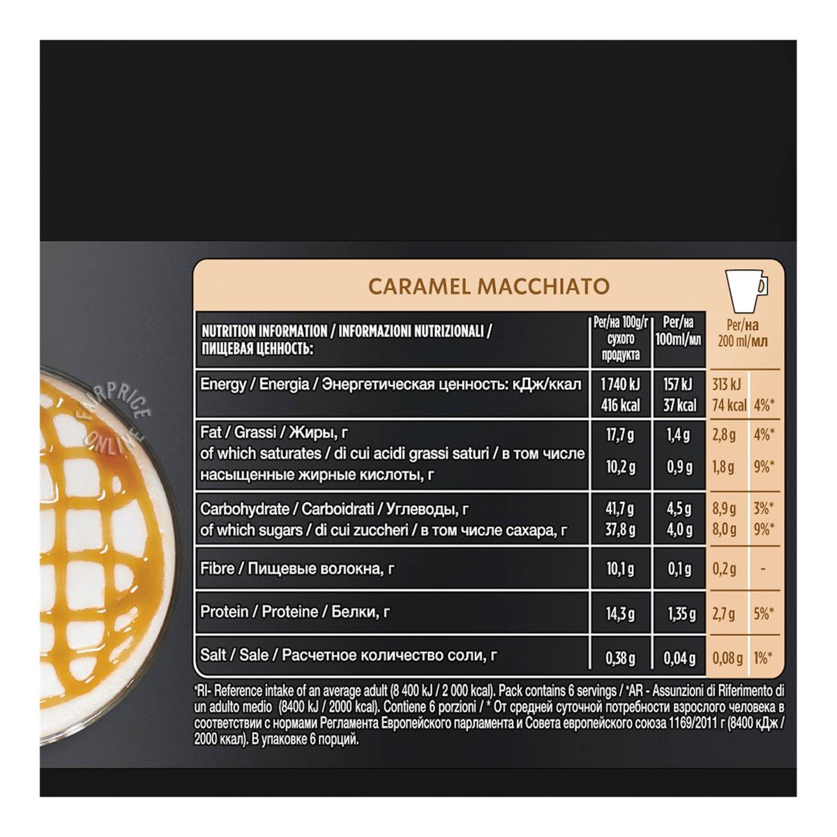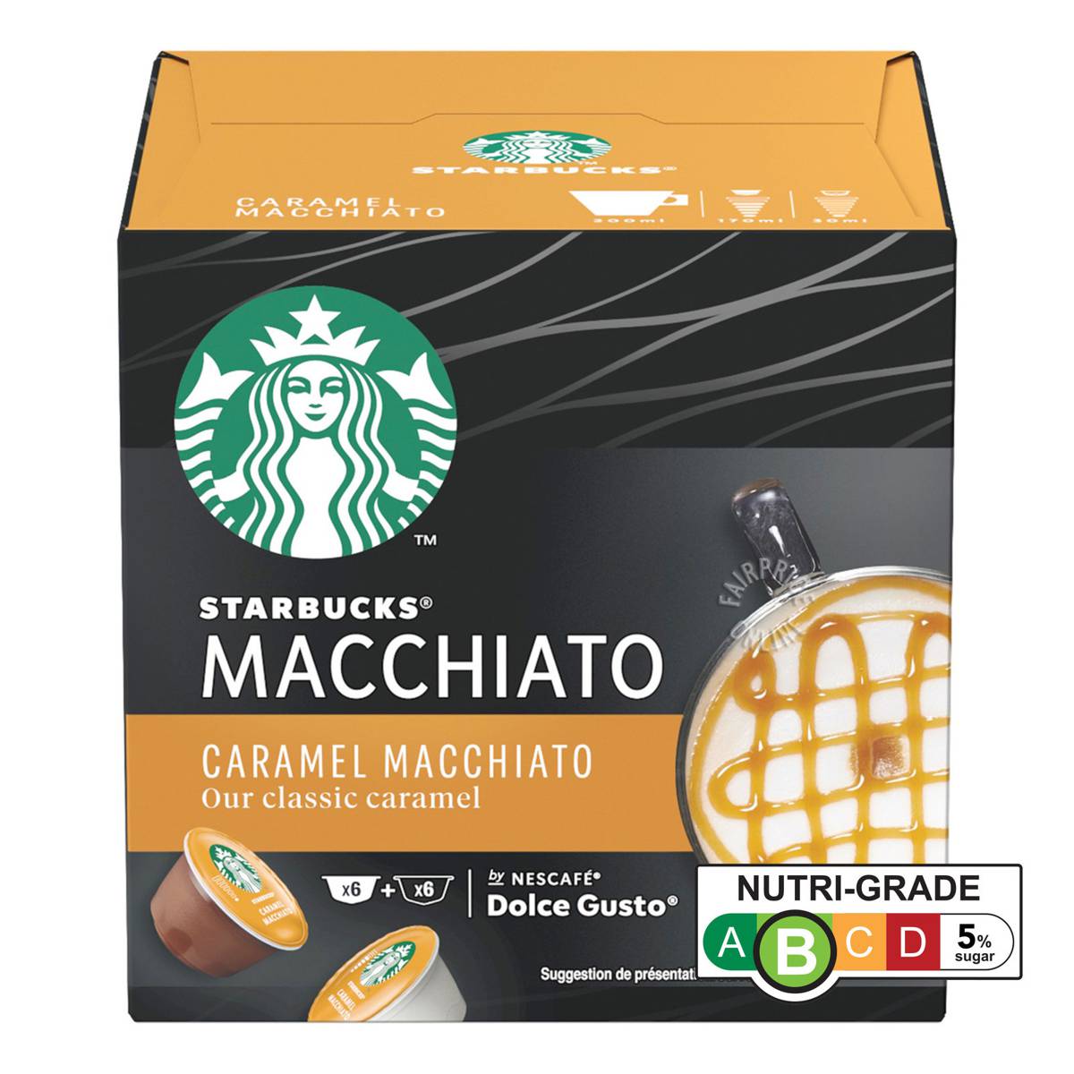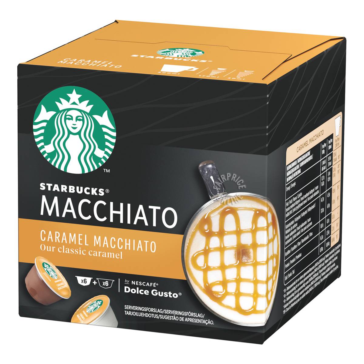 | KEY INFORMATION | The classic caramel taste.The box contains 6 capsules of Starbucks by Nescafe Dolce Gusto® Caramel Macchiato Coffee, with 6 milk capsules, designed for Nescafe Dolce Gusto® coffee machines. Create professional-quality coffees with a thick velvety cream, thanks to the machine’s high pressure. With our hermetically sealed capsules, which preserve coffee freshness, you’ll enjoy rich aromatic cups every time. |