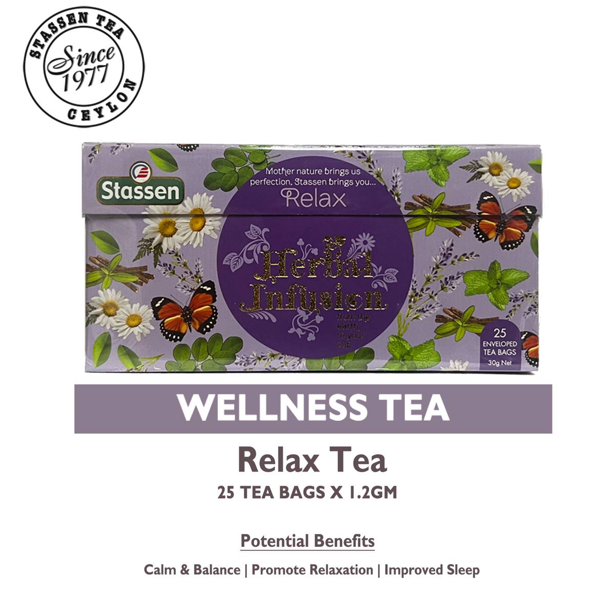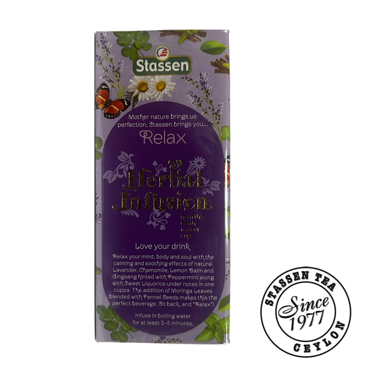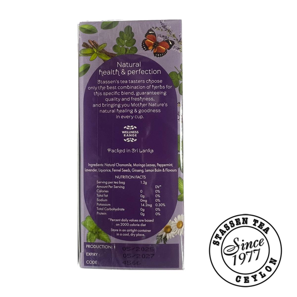| KEY INFORMATION | Relax your mind, body and soul with the calming and soothing effects of natural Lavender, Chamomile, Lemon Balm and Gingseng hinted with Peppermint along with Sweet Liquorice under notes in one cuppa. The addition of Moringa Leaves blended with Fennel Seeds makes this the perfect beverage to sit back and relax! Infuse tea bag in boiling water for 3-5 minutes, remove and enjoy! |