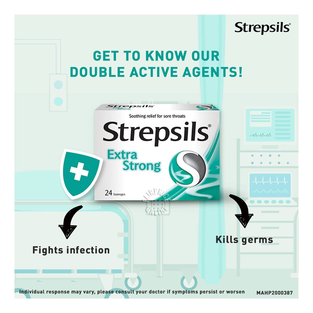 | – | Strepsils Extra Strong Lozenges contains two antiseptic ingredients (2,4-Dichlorobenzyl alcohol and Amylmetacresol) for use in throat medications. For pain associated with a more troublesome sore throat. Fights bacterial throat infections and numbs pain in throat. The menthol vapour action in Strepsils Sore Throat & Blocked Nose lozenges help to unblock the nose. |