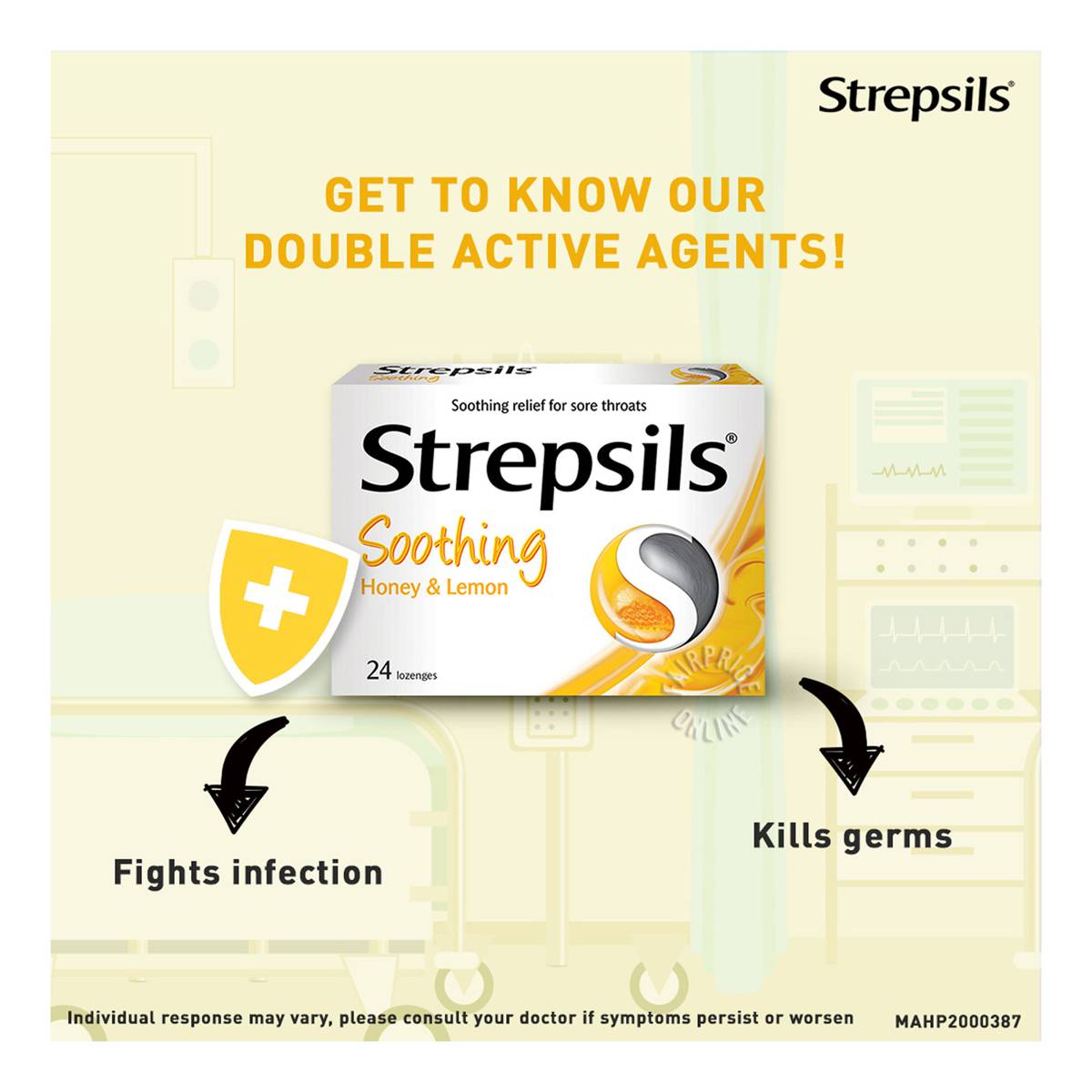 | – | • Fights bacterial throat infections and numbs pain in throat |