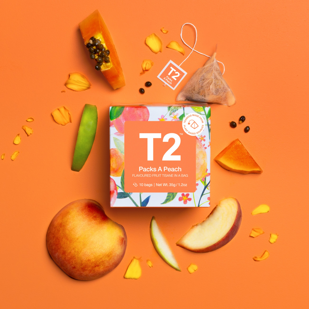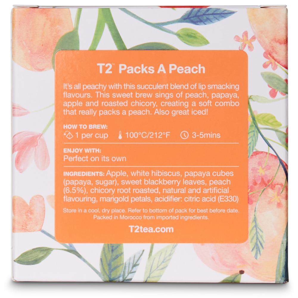 T2 Packs a Peach combines the boldest. brightest peach flavours with papaya. apple and chicory for extra sweet fruitness.
