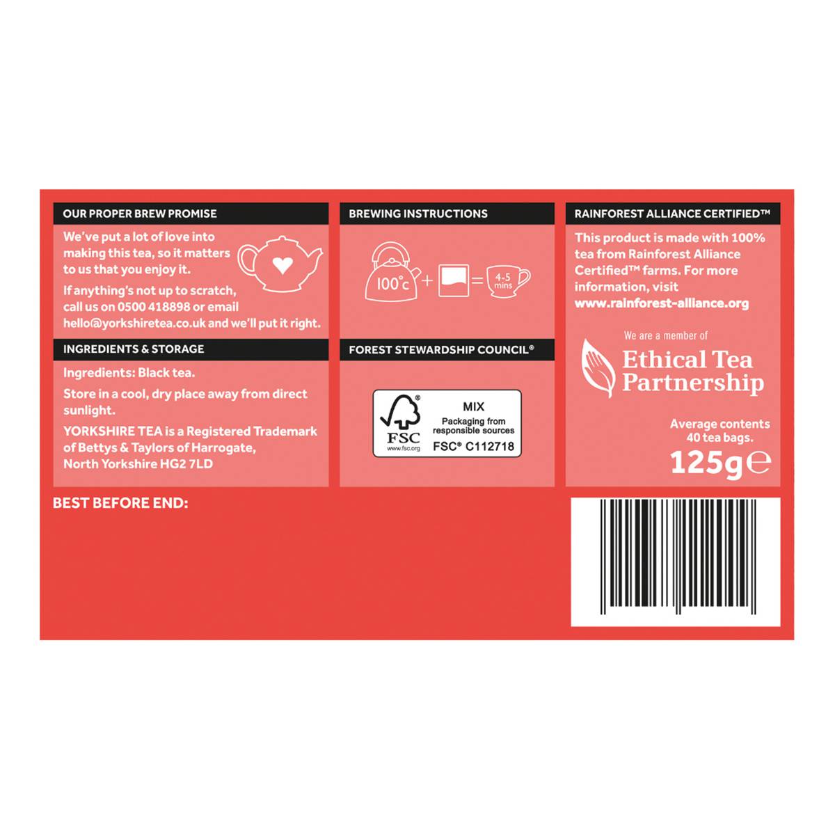 | KEY INFORMATION | Yorkshire tea, the proper brew that makes the difference. Blend of 3 leaf origins from the top 10 tea gardens in the world. |