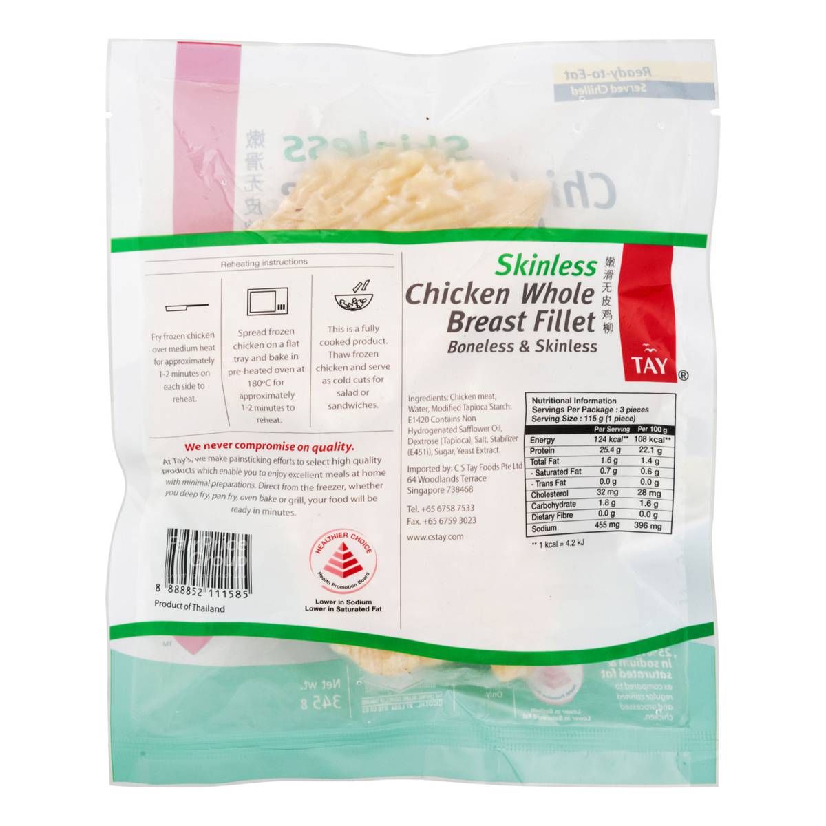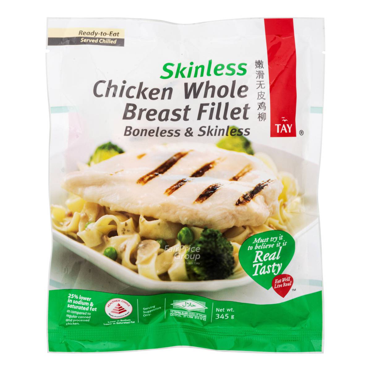 | KEY INFORMATION | Tay Skinless Chicken Whole Breast Fillet is not only healthy but extremely easy to prepare. This item is fatless, skinless, boneless and pre-portioned to suit a person’s meat content for one meal. What is even more amazing about this item is the fact that you can eat it chilled! Yes, no reheating is required for this! Salad lovers watch out! Just thaw overnight in the fridge and this item is good to go. Furthermore this item is certified Halal & Healthier Choice (for low sodium content). |