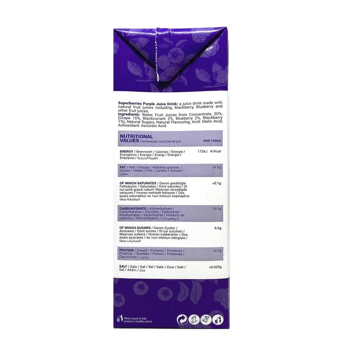 | KEY INFORMATION | Made with natural fruit juices. No artificial colours, No preservatives, No artificial sweeteners. We blend blackcurrants, blackberries, blueberriesand grapes to make our Superberries juice taste so delightful. This drink will fire you up in the morning, bursting with goodness and great taste. Imported by Hu Lee Impex Pte Ltd, Address: 16A Chin Bee Avenue Singapore 619945 |