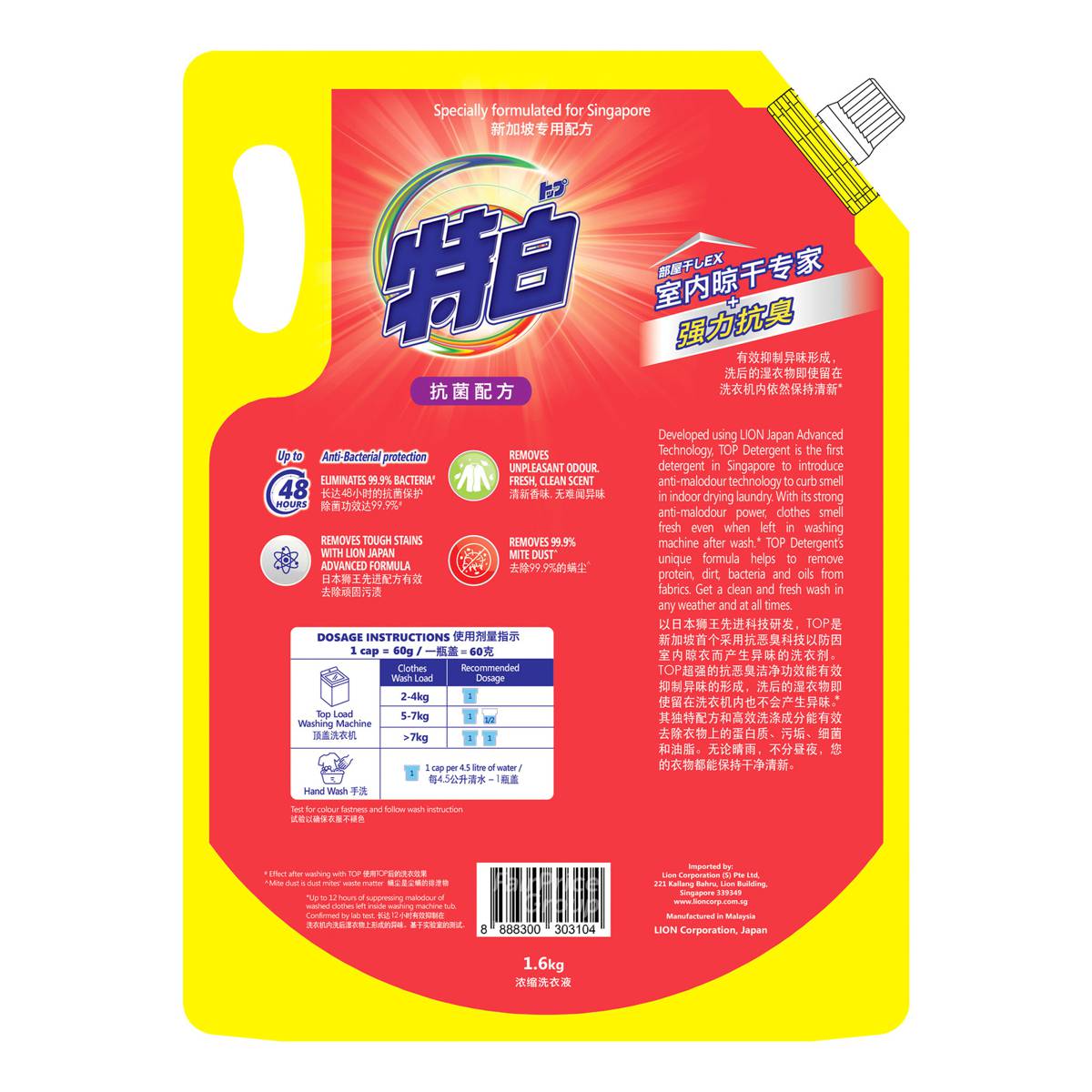 | KEY INFORMATION | Eliminates 99.9% of bacteria and colour protect – prevents colour fading and keep colours bright. Be it rain or shine, your clothes smells great even when dried indoors as Top rids odor-causing bacteria during washing cycle. Outpower stains and odours as the advanced Japanese formula easily removes tough stains and perspiration odors. No more overnight soaking with TOP’s powerful cleaning performance. This product is also suitable for hand wash and top load machine. |