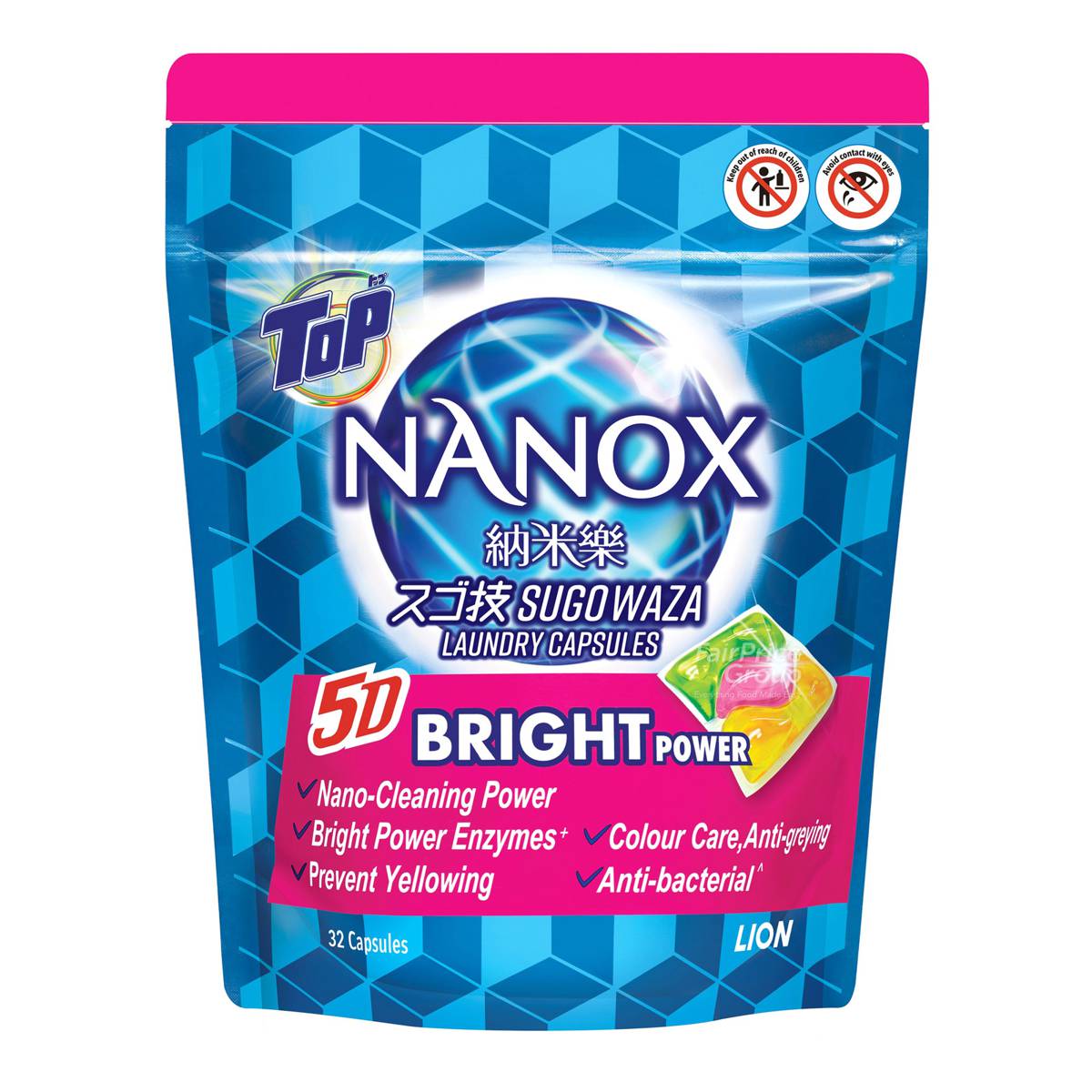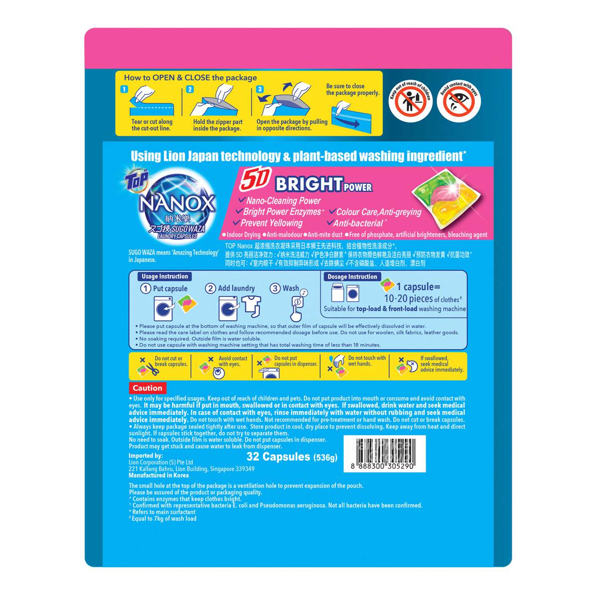 | – | • Using Lion Japan technology with 5D Bright Power: Nano-Cleaning Power, Bright Power Enzymes+, Colour Care, Anti-greying, Prevent yellowing, Anti-bacterial^ |