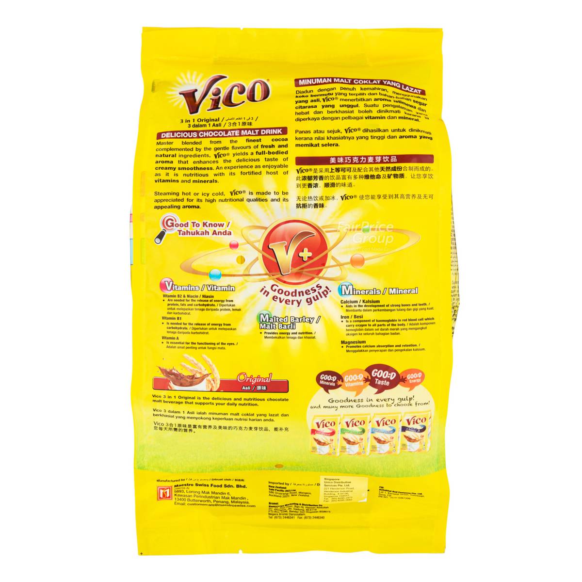 | KEY INFORMATION | Delicious chocolate malt drink that is blended from the finest cocoa and complemented by the gentle flavours of fresh natural ingredients, Vico yields a full-bodied aroma that enhances the delicious taste of creamy smoothness. Be it steaming hot or icy cold, experience an enjoyable beverage that is also high nutritious with its fortified host of vitamins and minerals. |