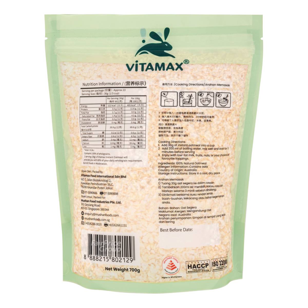 | KEY INFORMATION | Vitamax Instant Oatmeal is Australia Premium Quality Oatmeal. It contains no sugar and is naturally cholesterol free. A healthier choice of instant oatmeal for you and your family. What better way to start off your day than with a cup of Vitamax Instant Oatmeal, easy to prepare and fuss free! |