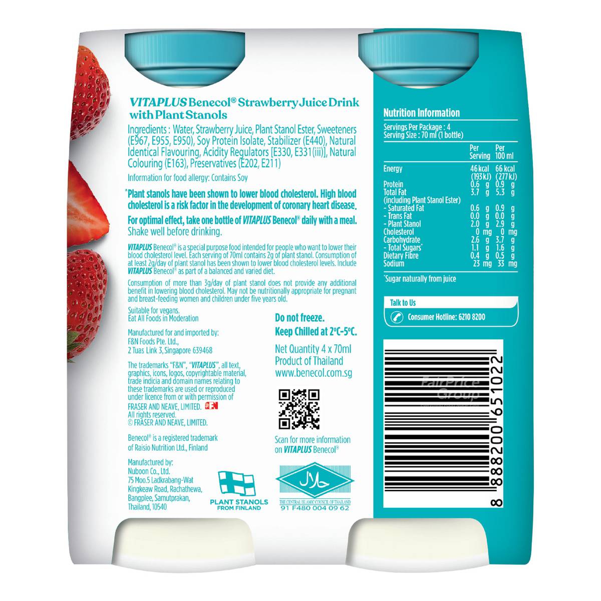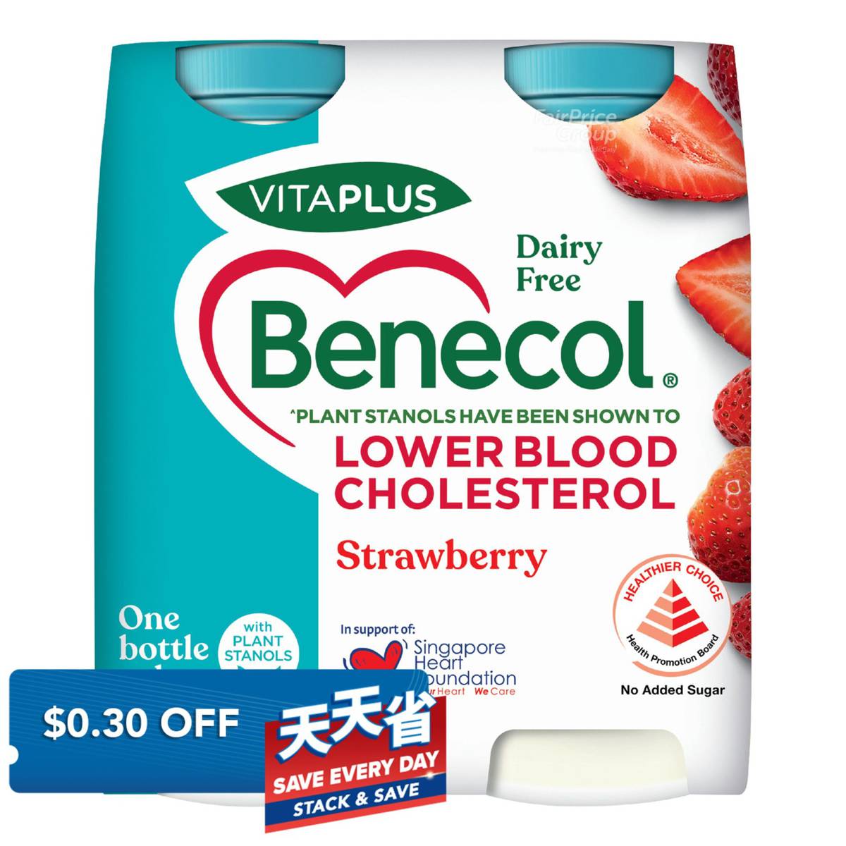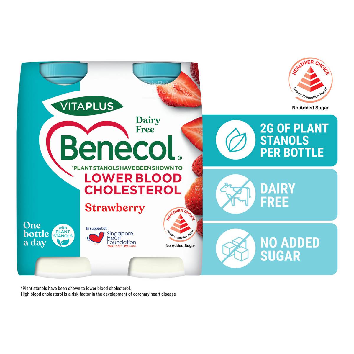 | KEY INFORMATION | Special purpose food intended for people who want to lower their blood cholesterol level. Each serving contains 2g of plant stanols. Consumption of at least 2g/day of plant stanol has been shown to lower blood cholesterol levels. VITAPLUS Benecol® contains 7g of plant stanols, which is found naturally mainly in grains, but also in corn, fruits and vegetables. Clinical studies have shown that plant stanols can lower blood cholesterol when taken daily with a meal. |