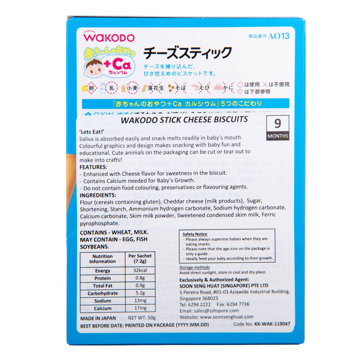 | KEY INFORMATION | Wakodo Stick Cheese Biscuits is enhanced with cheese flavour for sweetness, contains iron and calcium needed for baby’s growth and does not contain food colouring, preservatives or flavouring agents. |