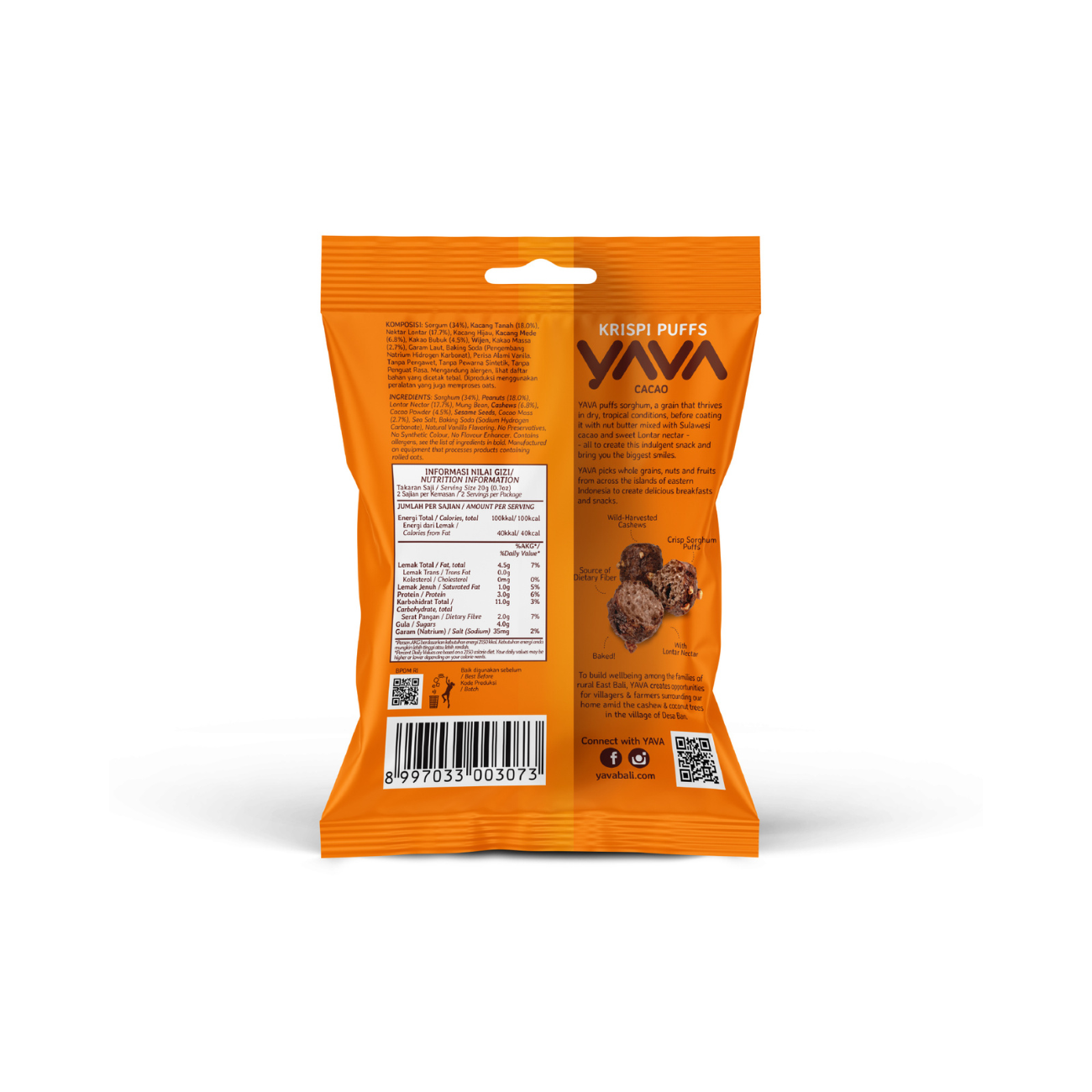 | KEY INFORMATION | YAVA puffs sorghum, a grain that thrives in dry, tropical conditions, before coating it with nut butter mixed with Sulawesi cacao and sweet lontar palm sugar, all to create this indulgent snack and bring you the big smiles. YAVA picks whole grains, nuts and fruits from across the islands of eastern Indonesia to create delicious breakfasts and snacks. To build wellbeing among the families of rural East Bali, YAVA creates opportunities for villagers & farmers surrounding our home amid the cashew & coconut trees in the village of Desa Ban. |