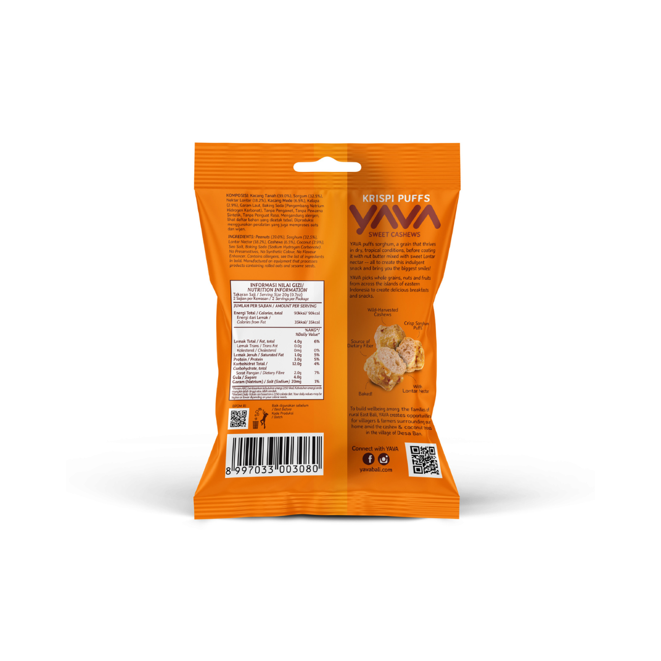 | KEY INFORMATION | YAVA puffs sorghum, a grain that thrives in dry, tropical conditions, before coating it with nut butter mixed with sweet lontar palm Sugar, all to create this indulgent snack and bring you the big smiles! YAVA picks whole grains, nuts and fruits from across the islands of eastern Indonesia to create delicious breakfasts and snacks. |