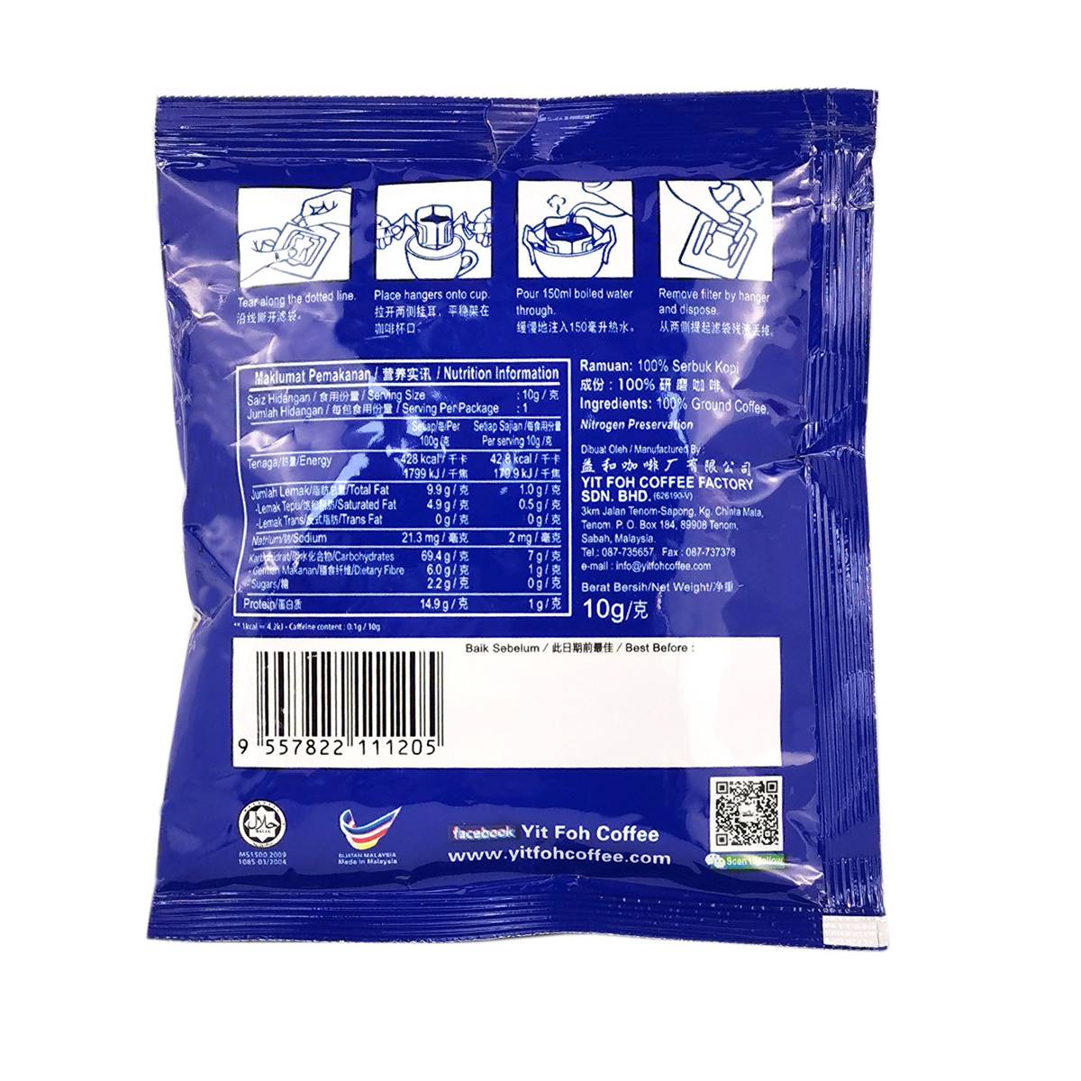 | – | Contains 8 individual sachet of 10g pure strong ground coffee |