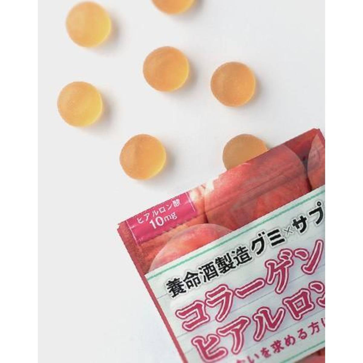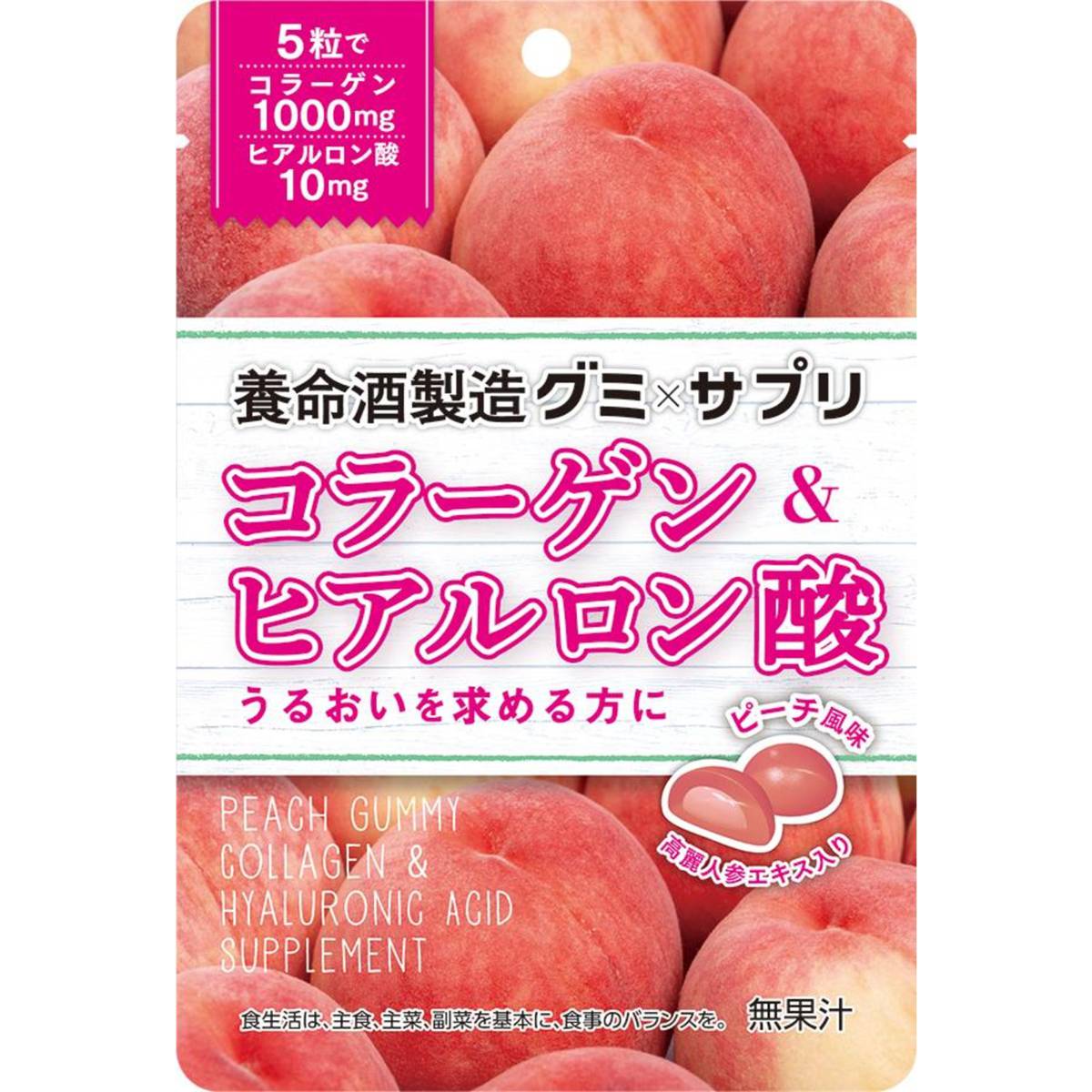| KEY INFORMATION | Multiplies the function of gummy candy and supplement. You can take nutritions easily and tasty. 2-layer stracture gummy which outside tastes springy and inside tastes soft and mosit. If you take about 5 drops per one day, you can have collagen 1000mg and hyaluronic acid 10mg intake. Ingredients: Glucose syrup (domestically produced), Sugar, Gelatin, Oblate powder, Concentrated peach juice, Collagen peptide, Eucommia ulmoides tea extract, Ginseng extract/ Sorbitol, Acid, Gelatinizer(pectin), Fravoring, Brightener, Hyaluronic acid, Emulsifier, Red radish pigment |