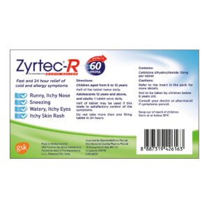 KEY INFORMATION – Zyrtec-R fast relief of cold and allergy symptoms: – • Runny – • Itchy nose – • Sneezing – • Watery – • Itchy eyes – • Itchy skin rash COUNTRY/PLACE OF ORIGIN COUNTRY/PLACE OF ORIGIN Switzerland PREPARATION – • For children aged 6 – 12 years: – Take half of the…